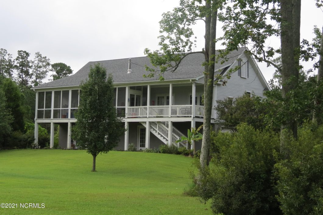 A gracefully elevated three bedroom home with delightful views of Broad Creek and surroundings! You’ll love the thoughtful design, function and livability of this charming residence – Built for views and presiding over the neighborhood on a raised building pad which was finished above the flood plain for security from any flooding eventuality. The property features an extra building lot for future family use or resale, making this an unbeatable investment value with a combined 1.2 acres! You approach the house up an asphalt driveway to the two-car garage. The garage has never flooded and has an amazing potential for living space, with a heated 12’5” x 28′ 3”studio area (used as a potter’s workshop and quilting room), as well as an adjoining storage room which could be converted into any number of imaginative uses! There is a full length covered patio facing the waterfront awaiting your outside projects. Upstairs is the gorgeous primary living areas… You’ll be delighted as you reach the expansive porch areas, some open & covered but mostly screened ( 9’4” x 36′)! Views and glimpses of Broad, Tar and Gideon Creeks are possible from this excellent vantage point! You’ll be tempted to sit and while away enjoying the sights and breezes. The Living Room and all of the bedrooms feature private French door access to the porches, maximizing privacy and entertaining flow. The home is a perfect layout for any size family. Much of the public area has wood floors and the living room has a Quadrafire wood stove for those chilly winter’s evenings. The dining area connects to an amazing gourmet eat-in kitchen, the home’s centerpiece. Lots of cabinetry, expansive counters and office area. The master retreat is sunny and provides room for reading/sitting or piano playing… A luxury ensuite bath is also yours. Two bedrooms, bath and a laundry room round out the upstairs. New HVAC -2021, new roof-2018 Lots of upgrades -water softener/reverse osmosis and so much more!